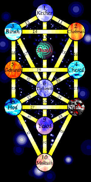 As you can see from the picture, the Tree is composed by ten cirlces, or spheres, the so-called " Sephirah " plus 22 life paths that link the spheres themselves. There is also another sphere, not a Sephiroth properly, which represents the final " KNOWLEDGE " ( Daath ) as an ultimate target of living beings. But let' s examine the Sephirah a little closer: