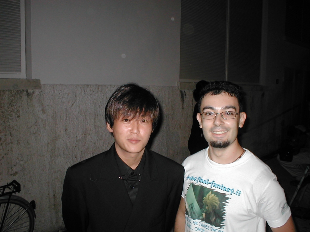 Voices of Tetsuya Nomura being somewhere nearby spread among the fans, but we couldn' t see any trace of him, and those who claimed to have contacted him and interviewed him made me both envious and unbelieving. Nevertheless, agitation and fears started to fade away when the first, unexpected encounter occurred: the chief redactor of Famitsu Magazine for the PS2 section, along with many others from his staff, approached us and asked us for an interview! Unbelievable!!! Famitsu Magazine, one of the most important, most informed and reliable japanese magazines about videogames and more, which had published a lot of AC material in the previous months, wanted to interview us - two otaku from Italy!!! Awesome!!! It seemed our T-shirt let them notice us, and so there we were, answering his question about FFVII, Advent Children and the Final Fantasy series in general, debating about an OAV sequel for a videogame and of our expectations from Nomura' s work. They took a lot of shots of us, front and back of our T-shirts, and we also managed to get a photo with them with our own digital camera.