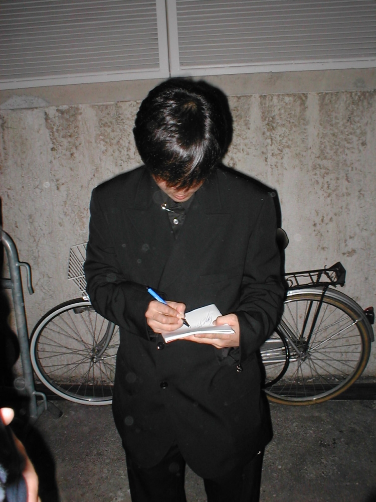They had gone rather fast past the celebrity exit, but I ran as hard as I could, dodging the security personnel and trying to catch up with Nomura out there. Night had fallen, and there were few lights on that path out of the Sala Perla, so I lost them in sight. Stopping for a moment, and glancing at a couple of other fans who were running beside me, I cried out loud to them, breathing hard: " Where HAS Nomura GONE??? " Both of them hadn' t a clue, but then I happened to slightly turn on my left, and standing just a couple of meters from me there was HIM. He had stopped seeing the fans wanted to reach him, and now he was there for us.